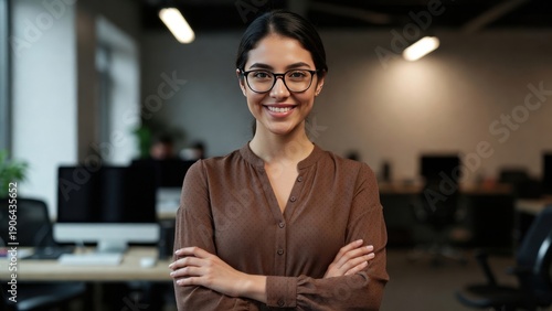 © mila103, Naklejka premium Confident young hispanic female professional in modern office setting.