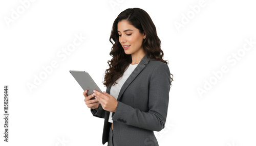 Fototapeta premium Confident young Hispanic professional analyzing data on her tablet, ready to...