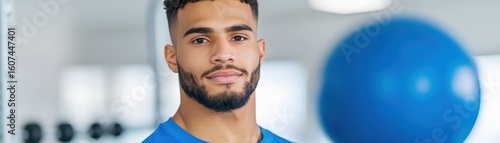 Obraz premium Confident Young Man in Gym Setting with Blue Exercise Ball