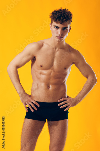 © SHOTPRIME STUDIO, Fototapeta premium Confident young man with curly hair posing in black swimwear against bright yellow background, showcasing fitness and health awareness.