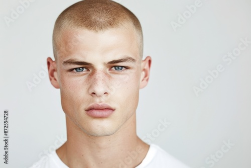 © mariiaplo, Obraz premium Confident Young Man with Short Hair and Piercing Gaze Studio Portrait