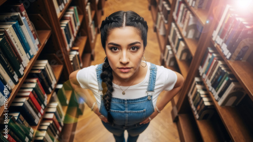 © Milan, Fototapeta premium Confident young student looking up from a library aisle. High-angle portrait surrounded by bookshelves. Education and knowledge concept.