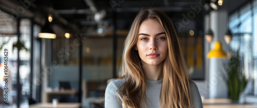 Fototapeta premium Confident Young Woman in Modern Office Setting with Stylish Decor