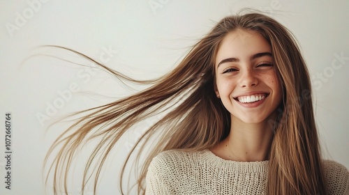 © WS Studio 1985, Fototapeta premium Confidently Smiling Woman with Long Hair Posing Against a Neutral Background, Radiating Joy and Positivity in a Natural, Candid Style