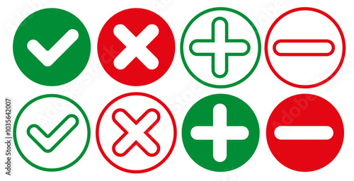 Fototapeta premium Confirmation or denial signs. Ticks and crosses, as well as pluses and minuses.