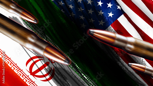 Obraz premium Conflict between Iran and USA shown through flags and bullets in an artistic...