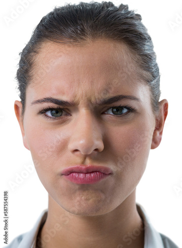 © vectorfusionart, Obraz premium Confused female executive against white background