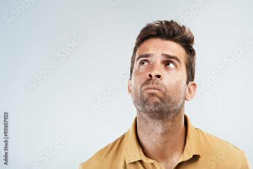 © Chanelle2000/peopleimages.com, Obraz premium Confused, man and thinking in studio for solution, problem solving and unsure with space for question or answer. Male person, thoughts and idea on white background with confusion, pensive and choice.