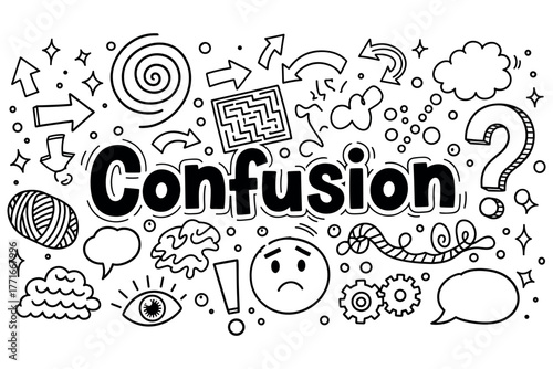 Obraz premium Confusion concept with doodles: arrows, maze, and question marks in black and...