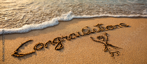 © DreamLayer, Fototapeta premium Congratulations Handwritten in Wet Beach Sand with Minimalist One-Line Trophy Illustration Beside Gentle Ocean Wave in Wide View