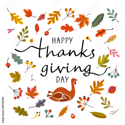 Fototapeta premium Congratulatory autumn banner Happy Thanksgiving Day. lettering and autumn leaves. flat vector illustration on white background