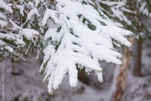 © Sabineyro, Obraz premium conifer branches are covered with snow