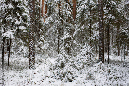 © Grigoriy, Fototapeta premium Coniferous forest after the first snowfall.