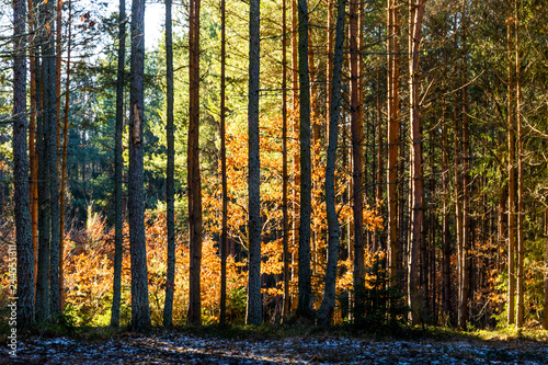 Obraz premium Coniferous forest illuminated by the morning sun on a spring day.