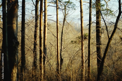 © sun_house_ann, Obraz premium coniferous forest in the rays of the setting sun. Trunks of fir trees at sunset