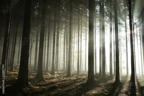 © Aniszewski, Fototapeta premium Coniferous forest lit by the morning sun on a foggy day