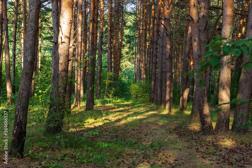 Naklejka premium coniferous forest, morning in the coniferous forest, old pine trees.