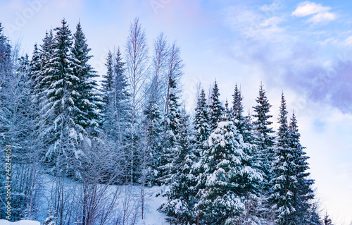Naklejka premium Coniferous forest, spruce in snow in frosty haze against blue sky, winter landscape,