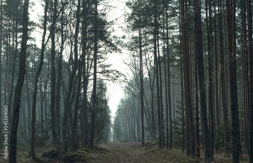 © Pawe, Obraz premium Coniferous forest with fog. Magic forest