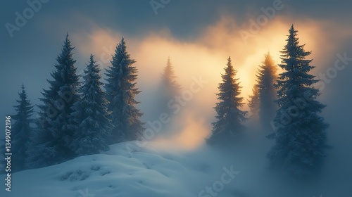 Fototapeta premium Coniferous trees, blanketed in snow, rise through thick fog, crafting a...