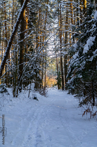 Fototapeta premium Coniferous winter forest with snowy road by day