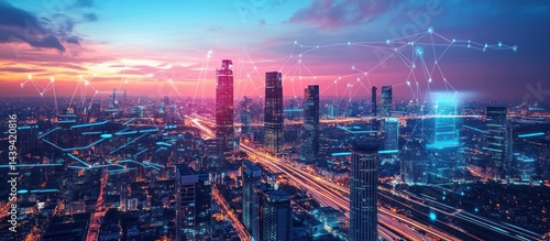 © Lesuna, Fototapeta premium Connected City Skyline at Dusk