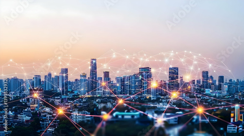 © Parsudi, Fototapeta premium Connected City Skyline at Sunrise