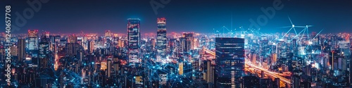 Fototapeta premium Connected Cityscape Nighttime Urban Landscape with Luminous Network, Vector Illustration