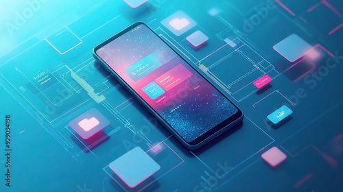 Fototapeta premium Connected Future: Smartphone Navigating Digital Landscape - A sleek smartphone with messaging app open, hovers above a vibrant, futuristic interface, symbolizing the seamless integration of technology