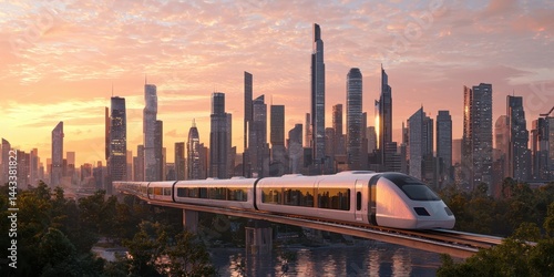 Naklejka premium Connected public transport. A futuristic train travels through a vibrant city skyline at sunset.