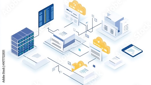 Fototapeta premium Connected Workspaces: Smart devices sync with cloud solutions to optimize document management and team collaboration.