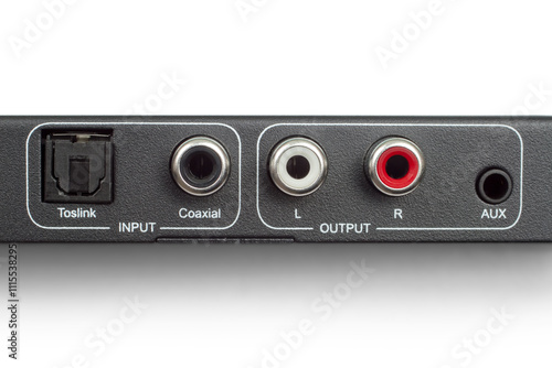 Obraz premium Connectors for connecting audio devices. Toslink, coaxial, RCA and mini-Jack. Digital-to-analog converter interface.