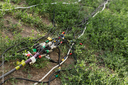 © Kate, Naklejka premium Connectors for music and microphone for a festive party. Wires with connectors xlr lie on the ground and on the grass