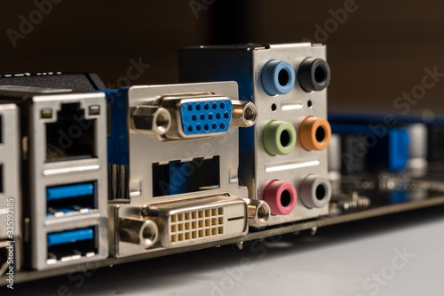 © Provokator, Obraz premium connectors on the back of the computer motherboard, usb hdmi lan