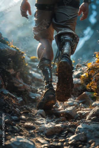 © Tetiana Kasatkina, Obraz premium Conquering the mountains: person with a prosthetic leg on a trail