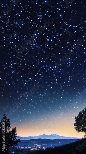 Fototapeta premium Constellations and stars shine brightly over a mountain landscape