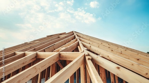 Obraz premium Constructing a wooden roof frame against a bright blue sky on a sunny afternoon
