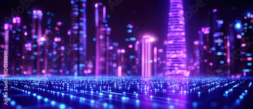 Obraz premium Construction and Technology, A vibrant futuristic cityscape illuminated with neon lights and digital patterns, showcasing innovation and energy.