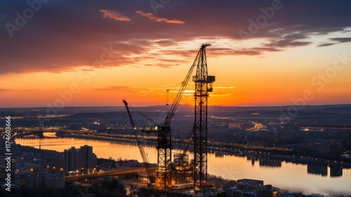 © Ferman Bagus Istuhri, Obraz premium Construction at Sunrise Over Cityscape