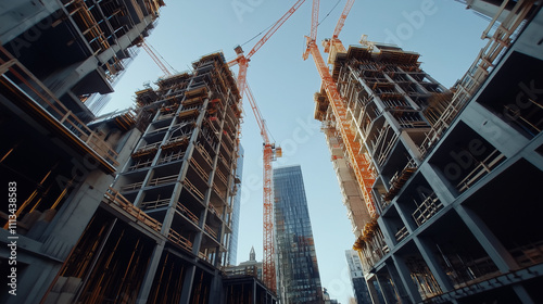 © Eka, Fototapeta premium construction bustling with activity, featuring towering cranes and tall, completed buildings