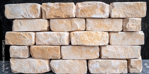 © AImagine Designs, Obraz premium Construction concept using lightweight bricks. Stacked light-colored stones arranged in a solid formation against a dark background