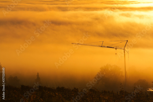 © ArtmannWitte, Naklejka premium Construction crane in the fog at sunrise