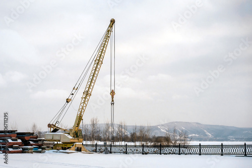 Fototapeta premium Construction crane on a winter day on a frozen river