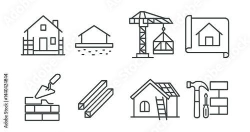 Fototapeta premium Construction elements icons set – house, blueprint, crane, bricks, tools, hammer, scaffold
