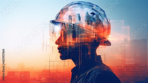 © Supatsorn, Fototapeta premium Construction engineer looking at blueprints and working cranes on building site
