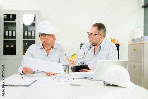 © Nuttapong punna, Obraz premium Construction engineers reviewing blueprints and tablet at desk. Team collaboration and planning for architecture or renovation project