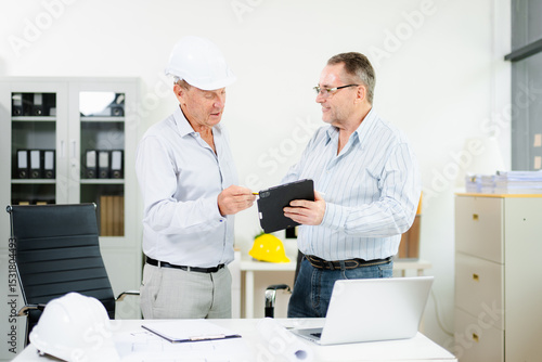 © Nuttapong punna, Obraz premium Construction engineers reviewing blueprints and tablet at desk. Team collaboration and planning for architecture or renovation project