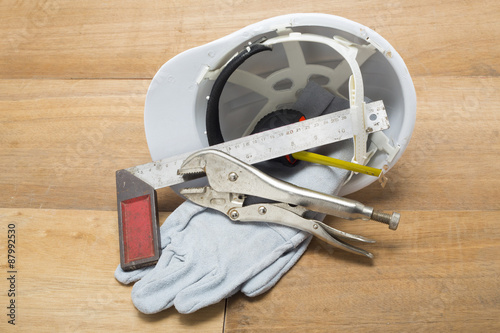 © titipong8176734, Fototapeta premium construction hat and gloves white backgrund