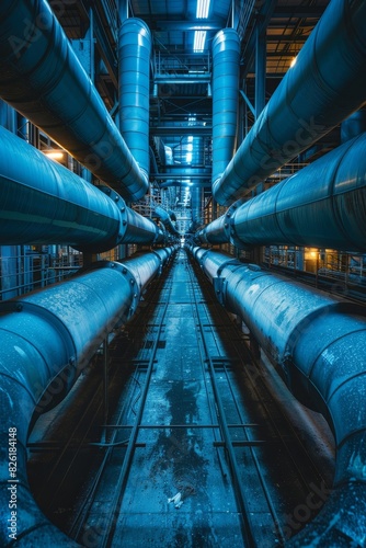 Fototapeta premium Construction, Industry and Development Concepts: Cool tones and perspective view of industrial pipes in a complex network