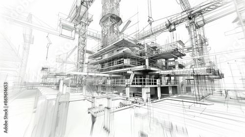 © Jiraphiphat, Obraz premium Construction insurance with busy building site, detailed architectural sketch, industrial tones